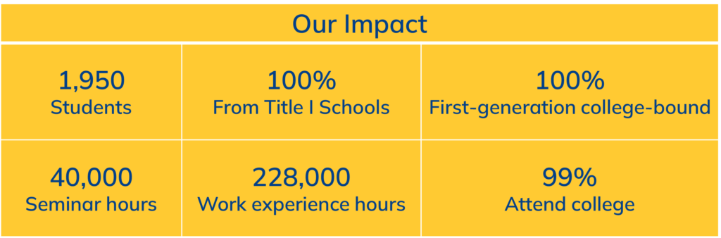 Each $5,000 sponsorship provides one student with over a paid internship and 18+ hours of engaging seminars centered on professionalism, college preparation, and civic engagement. The institute starts on June 15, the paid internship is from June 15 to July 27 (complete list of dates) and can take place at your company or, if you prefer, at a partnering non-profit organization.