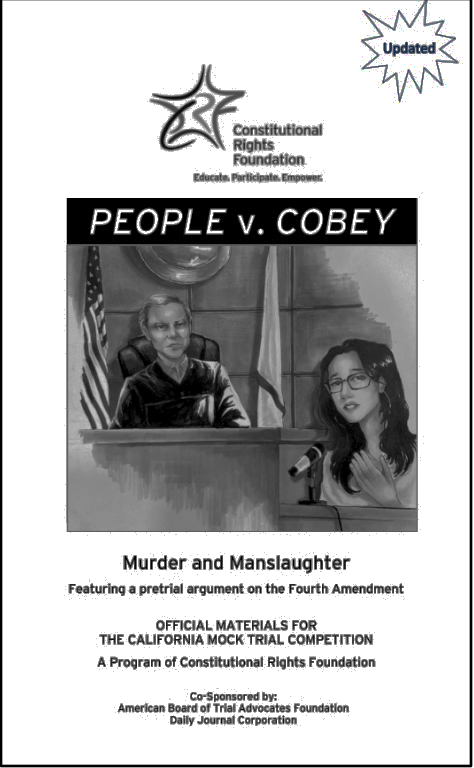Mock Trial s take students to the heart of the justice system. Students acquire critical-thinking skills and an in-depth understanding of our judicial process as they study a hypothetical case, conduct legal research, and role play the trial. Each Mock Trial packet includes a hypothetical case, witness statements, legal authorities, trial instructions, and procedural guidelines. It also includes a pretrial motion, designed to deepen student understanding of constitutional issues related to criminal trials.